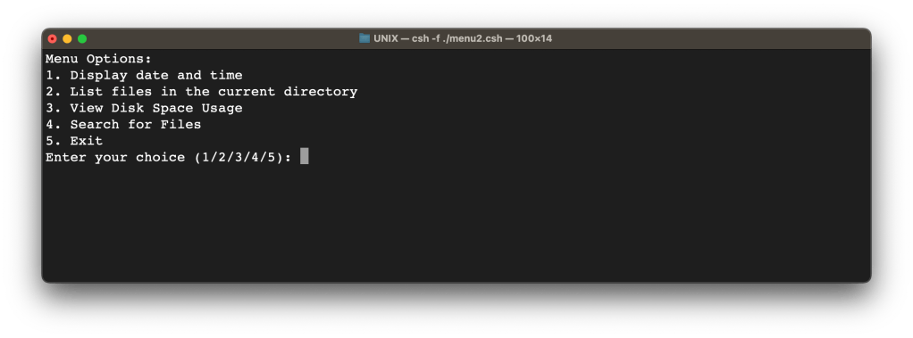 echo -n "Enter your choice (1/2/3/4/5): ": This prompts the user to enter their choice by displaying a message on the screen without a newline character (-n).set choice = $<: This line reads the user’s choice (a single-digit number) from the keyboard input and stores it in the variable$choice.- The script uses conditional statements (