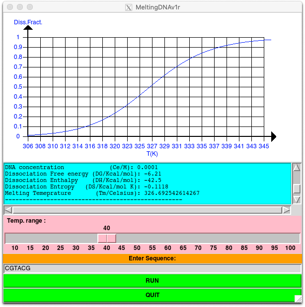 The PERL/Tk code reported in the appendix is an implementation of the model described in the previous paragraphs. In the Tk GUI, you can insert the nucleotide sequence and the range of temperatures with respect the Tm to visualize for the population curve. The concentration of the DNA is fixed to 0.0001 M. You can modify this value in the program but changing the variable Ce. Upon runnign the code, you can read the value of free energies, enthalpies and entropies and the Tm. In addition, the population curve is plotted in the upper panel as shown in the Figure 1.