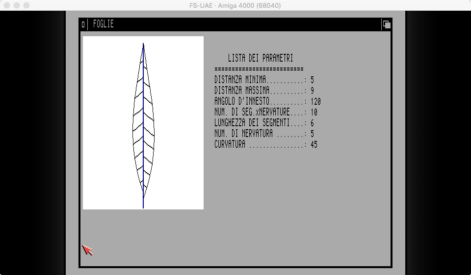 In my archaeological exploration of old computer files, I came across another simple but exciting Amiga Basic program I programmed in 1989. It is named “Foglie”, the Italian name for leaves. It was an attempt to explore some ideas of functional plant morphology modelling. The stimulus comes after the reading of the paper by Karl J. Niklas on issue 213 of Le Science (the Italian edition of the Scientific American magazine [1]). The article titled “Computer-simulated plant evolution” described the modelling of plants to study their interaction with the environment. It was a fascinating paper; still, simple and primitive graphics caught my imagination. Nowadays, the field of digital morphology has come to an age (just to mention one, Avatar), and we can have an idea of this progress in the level of realism in movies, video games, and TV programs. However, the organism’s form and shape have always caught my curiosity and interest. The structure of leaf nervation was an intriguing pattern related to my acquaintance with the fascinating fractals objects, another recurrent topic in the pages of scientific magazines of the period.