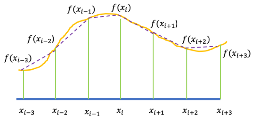 A better estimation of first derivative can be obtained by considering more points. In this way, the derivative can be calculated from the polynomial approximation of the function among the different point. 4-and 5- points approximation can be derived considering the following Taylor expansions: