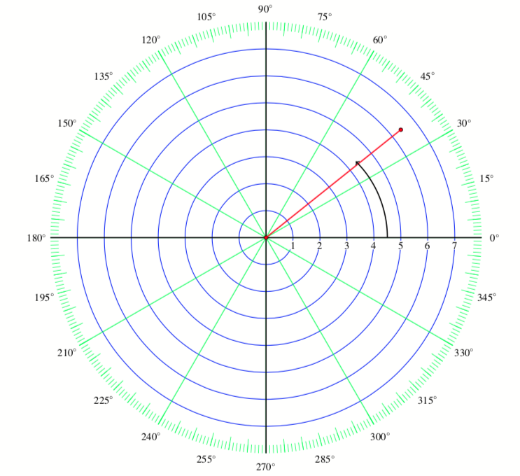 On the Argand plane, a complex numbers in polar coordinates is described using the distance and the angle