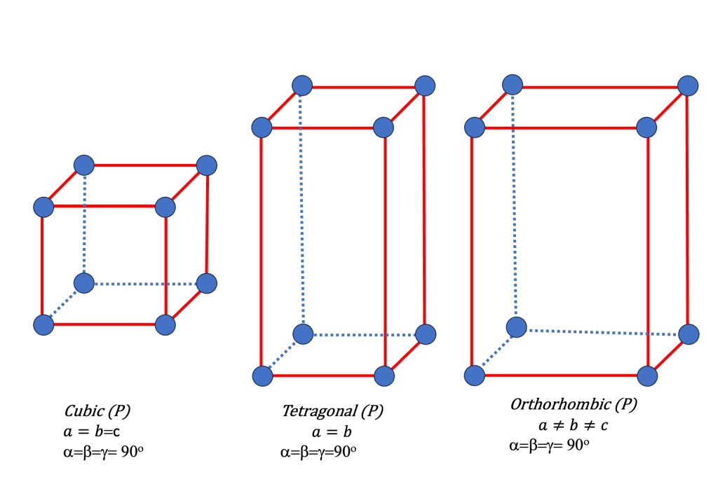 - Orthorhombic (P): This lattice has three different lattice parameters (a ≠ b ≠ c) and all angles are 90 degrees. It is characterized by unequal axis lengths.