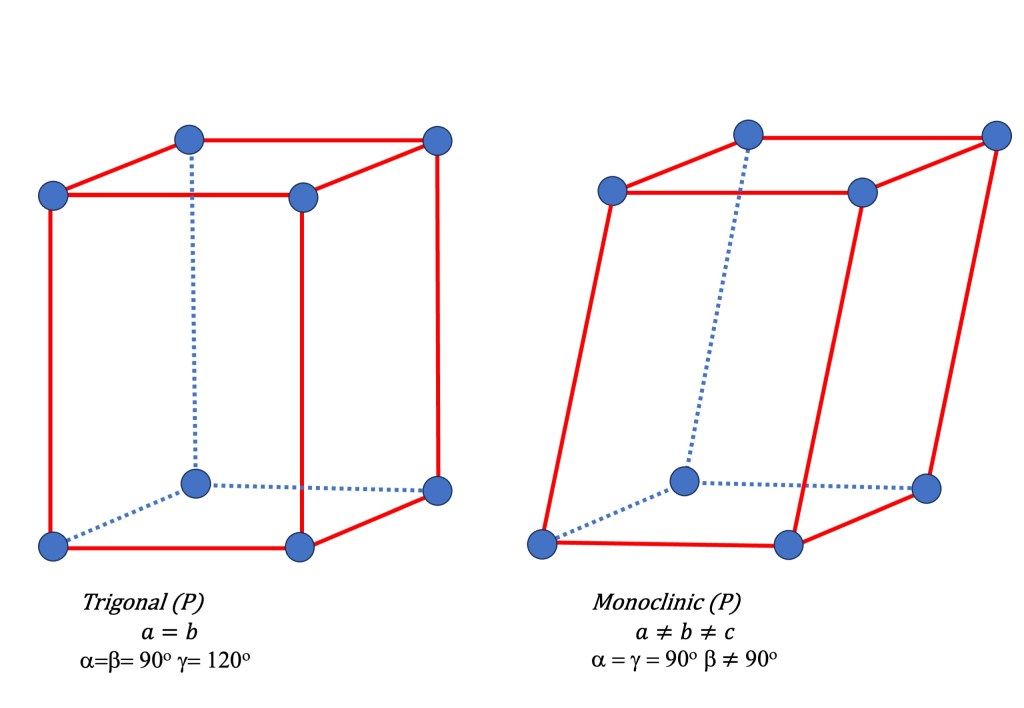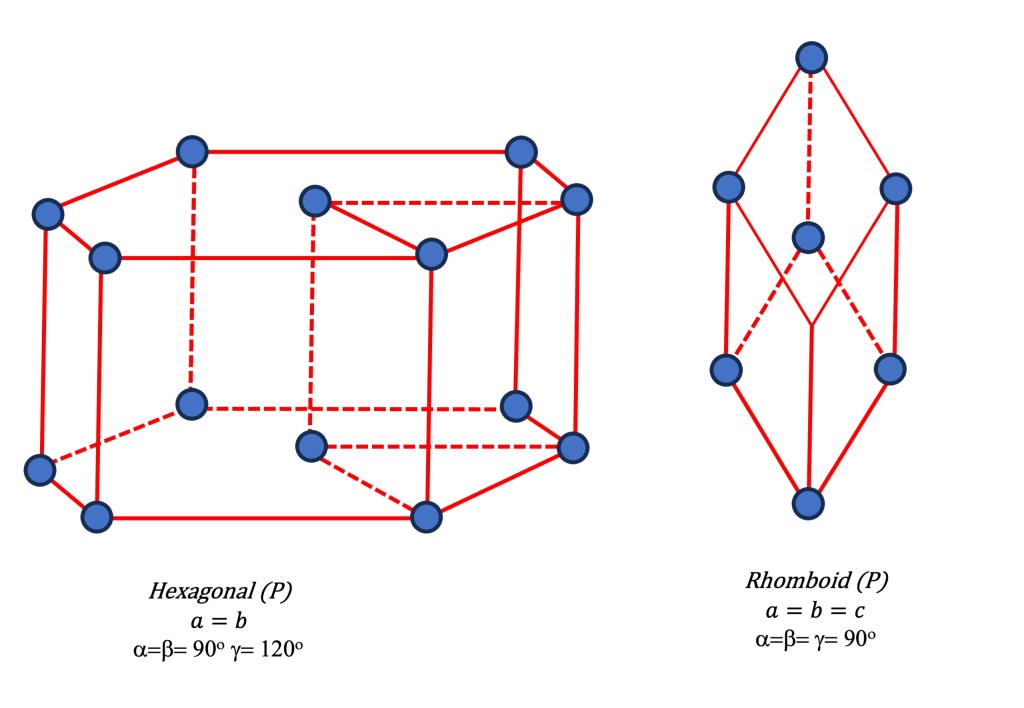 - Trigonal/ Rhombohedral, Hexagonal (P): Rhombohedral can be derived by deforming and pulling the cubic lattice along one diagonal. Therefore it has three equal lattice parameters. (a=b=c) but all angles are non-90 degrees. It forms a rhombohedron shape. It has a triangular symmetry.