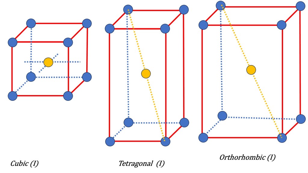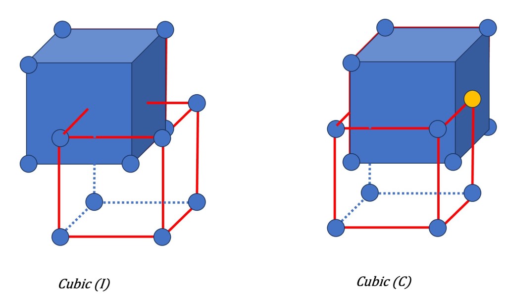 - Body-Centered Symmetry (I): In a body-centered lattice, there is an additional lattice point positioned at the center of the unit cell in addition to the lattice points located at the corners. This symmetry results in a center of inversion, meaning that if any point in the lattice is inverted through the center, it will coincide with another lattice point. This symmetry is denoted by the symbol “I” and is one of the possible additions to the primitive lattices.