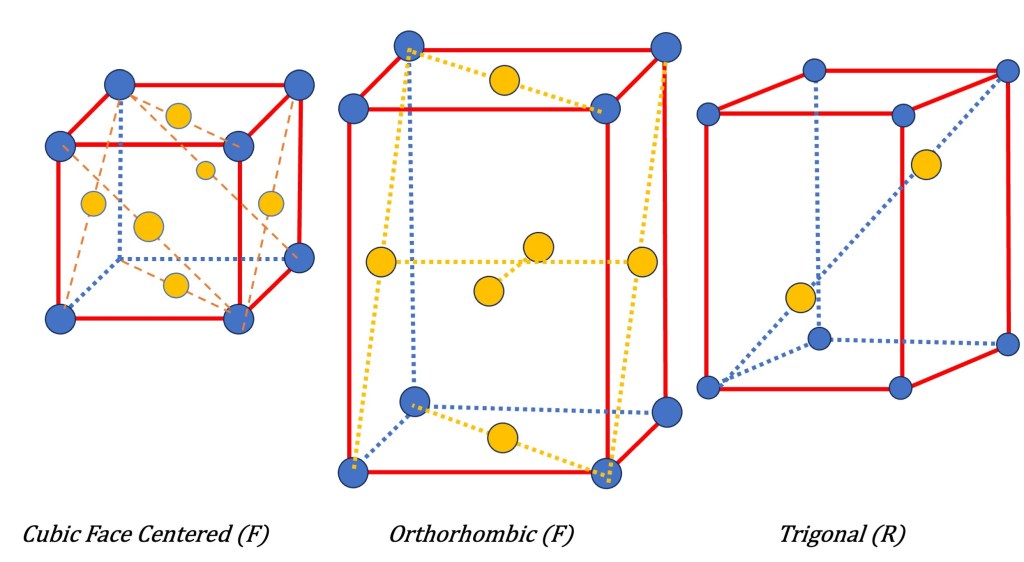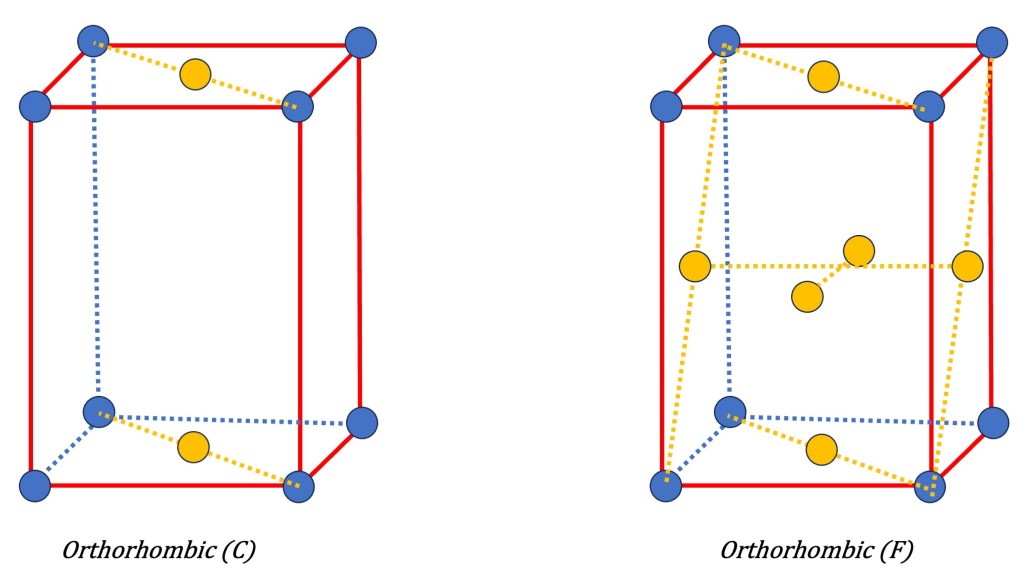 - Face-Centered Symmetry (F): In a face-centered lattice, lattice points are not only positioned at the corners of the unit cell but also at the center of each face. By adding these additional lattice points, the symmetry of the lattice enhances. Face-centered lattices possess various symmetry elements, including mirror planes and glide reflection symmetry. The symbol “F” denotes face-centered symmetry in the Bravais lattice notation.