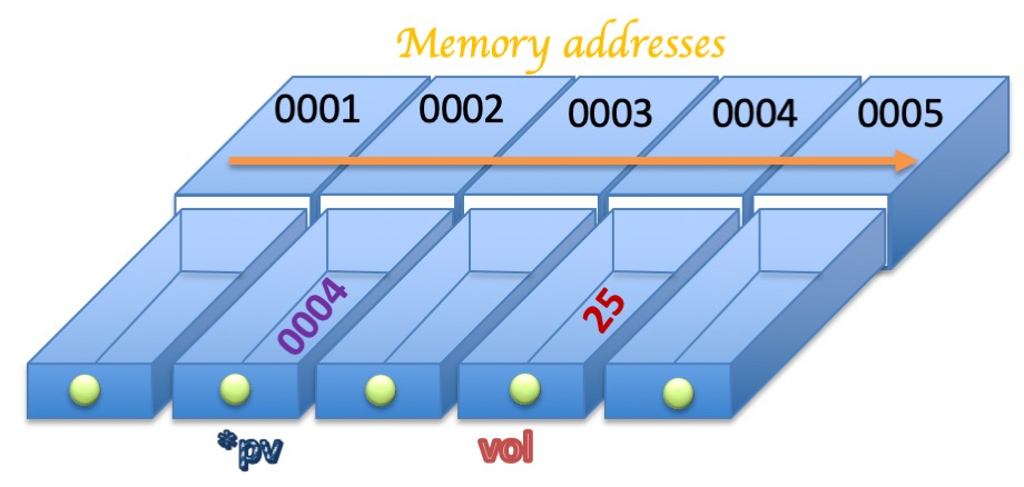 Figure 1 shows in a pictorial form the locations in computer memory (drawers) of the variable vol and its pointer *pv. Each memory location has a numerical address indicated by the number on the top.