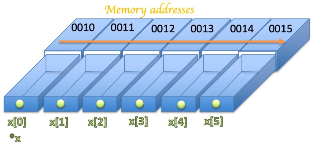 Pointers turn to be very useful when you need to work with arrays. To understand the reason, we need to clarify the way in which the C language organize an array variable in the physical memory of the computer. Shall we define the following array for coordinates