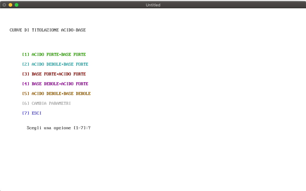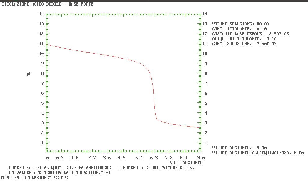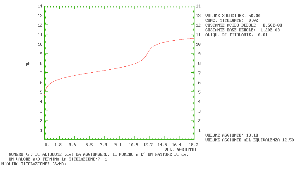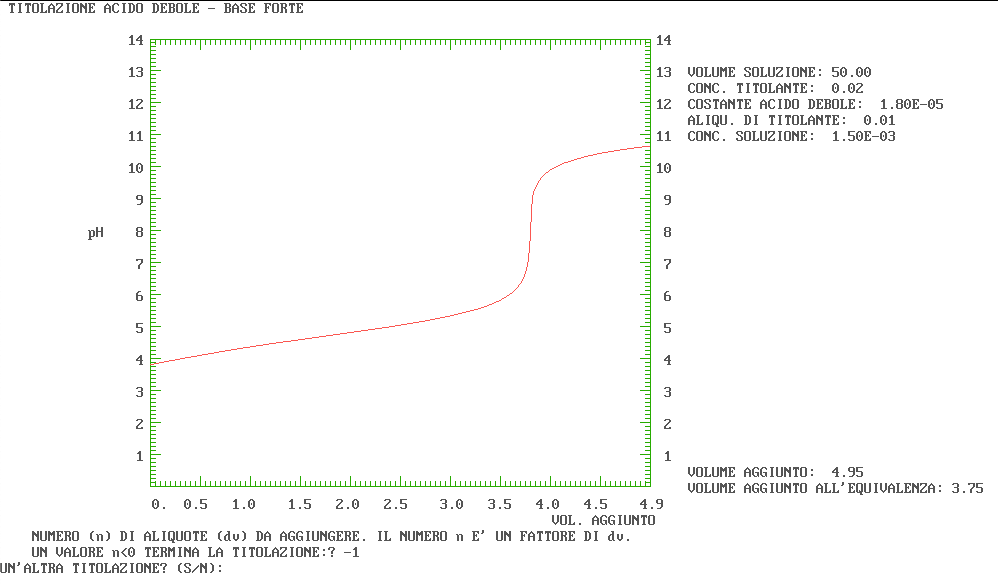This program version also allows the simulation of titrations with weak base or weak (mono) protic acid. The program shall use predetermined values for titration parameters which may be modified. Titration can be done step by step by adding aliquots of acid and bases or entering a negative number.
