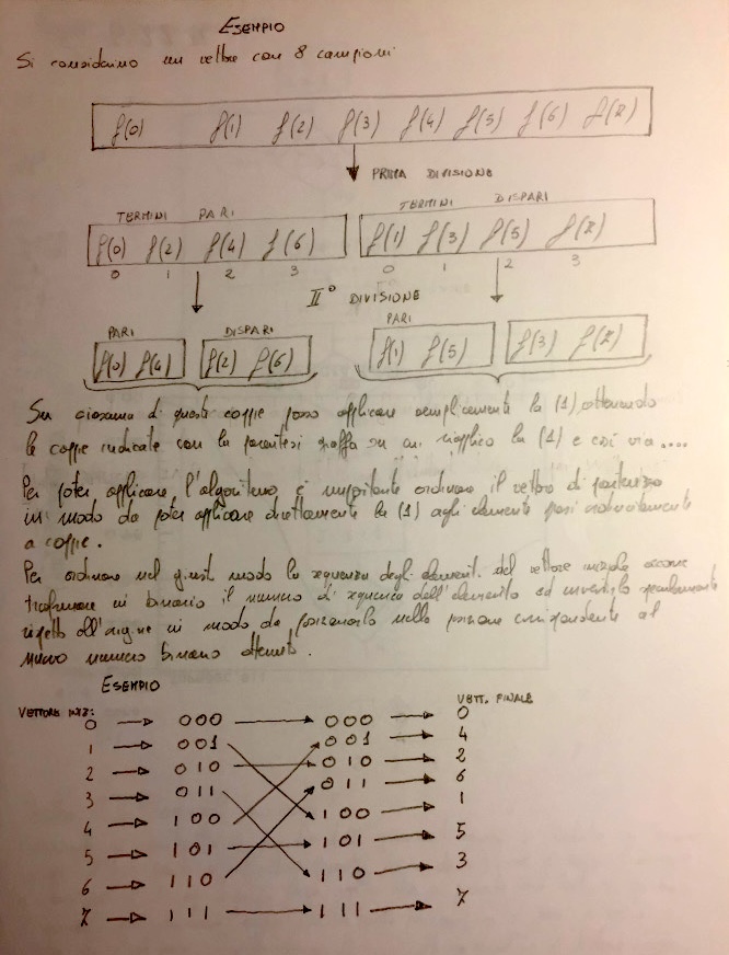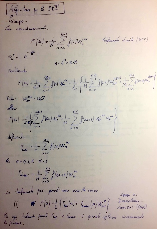 The first page shows the derivation of the FFT by splitting the discrete Fourier transform into even and odd indexed samples.This recursive decomposition reduces the original transform of size N into two transforms of size N/2.
