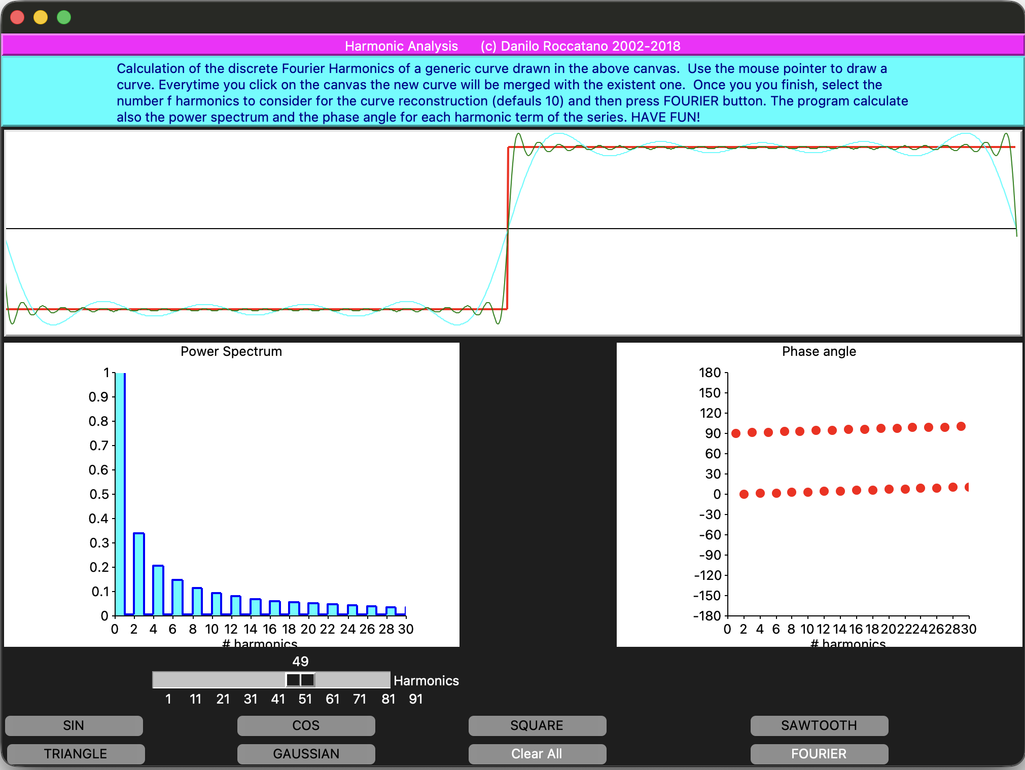 You draw a signal directly on a canvas (the program also gives the possibility to plot automatically standard signal curves such as the sin, cos, square, triangle, sawtooth, and Gaussian).