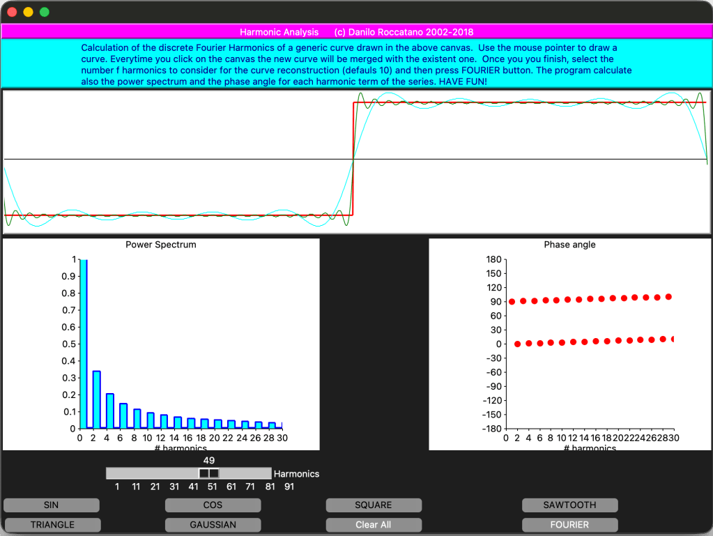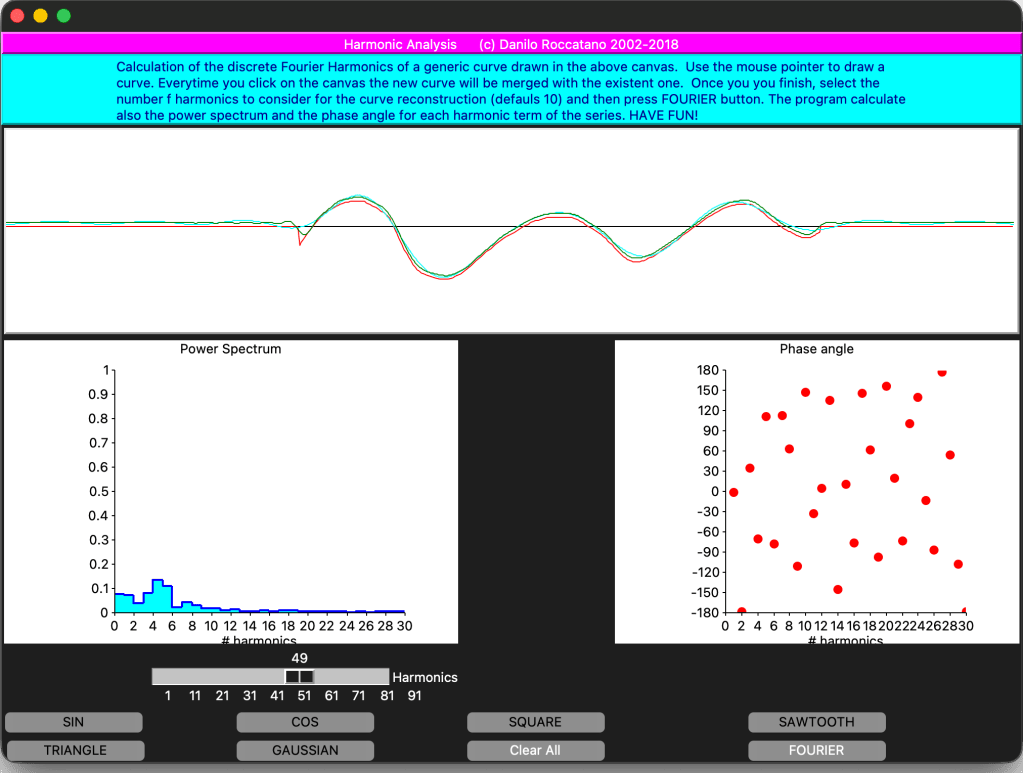 Using the mouse, you can also draw a function on the upper canvas, calculate numerically the Fourier coefficients, and plot a number of terms of your choice from the discrete Fourier series.
